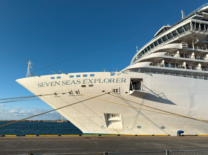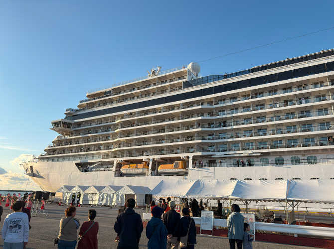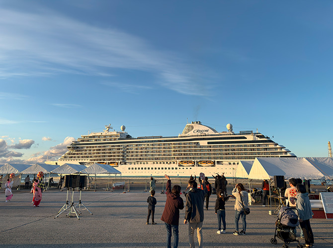 昨日(10/23)の夕方、酒田に初寄港のクルーズ船、セブンシーズ・エクスプローラー(SEVEN SEAS EXPLORER)が16時に出港予定だったので、手を振りに行ってきましたw