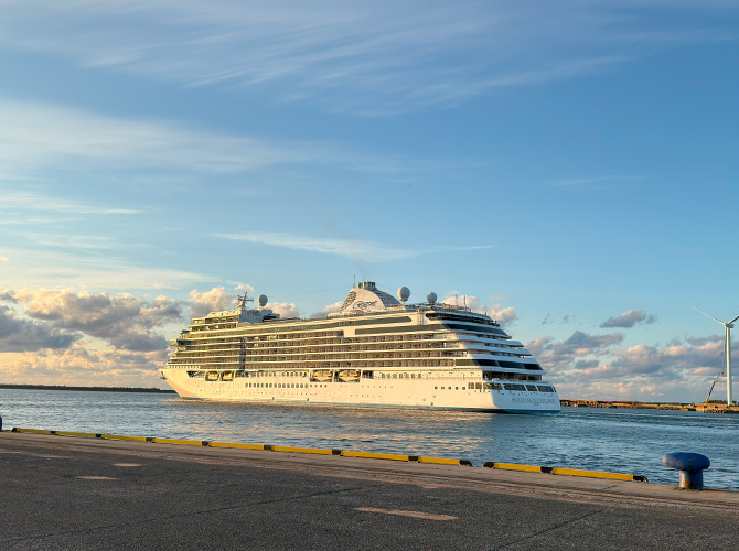 このセブンシーズ・エクスプローラーは、約600億円かけて建造された世界最高峰の豪華客船と言われ、乗船できるゲストが最大でも750人と少なめ、客室の98%がプライベートバルコニー付で、全客室オーシャンビューのスイートルーム。スタッフ1人に対するゲストの人数が1~1.5人という贅沢な比率。という事です。