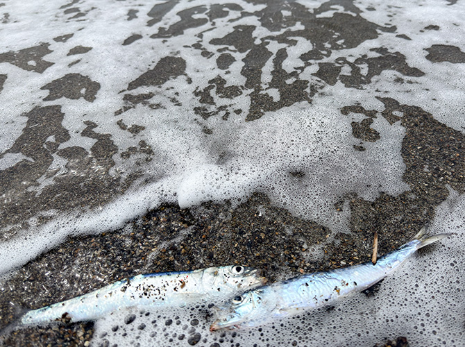 11時過ぎに帰ろうと歩いていると、波打ち際でイワシがピチャピチャと打ち上げられている。