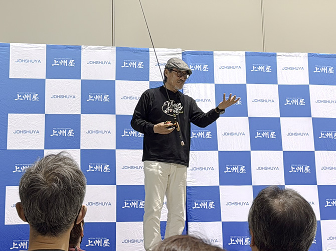 続いてシマノ フィールドテスター?の村田基さんのキャスティングについての講演が始まり、YouTubeなどの動画で何度か見たのと殆ど同じ内容では有ったが、目の前で実際に見るとまた違ったリアル感で楽しめた。